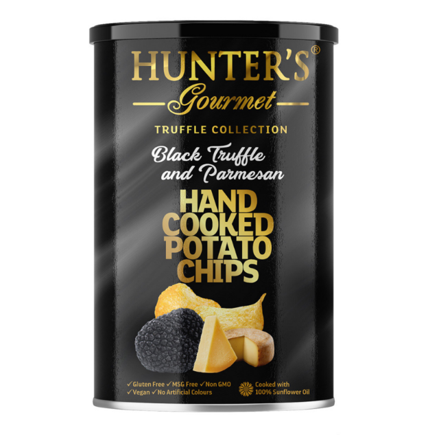 Hunter’s Gourmet Hand Cooked Potato Chips – Black Truffle – Truffle Collection (40gm) 40gm Canister. Potato Chips, Gluten free, MSG Free, Non GMO, Vegan, No Artificial Colours, No Artificial Preservatives, No Cholesterol, No Trans Fat, Dairy Free, Lactose Free, Halal, Cooked with 100% Sunflower Oil.