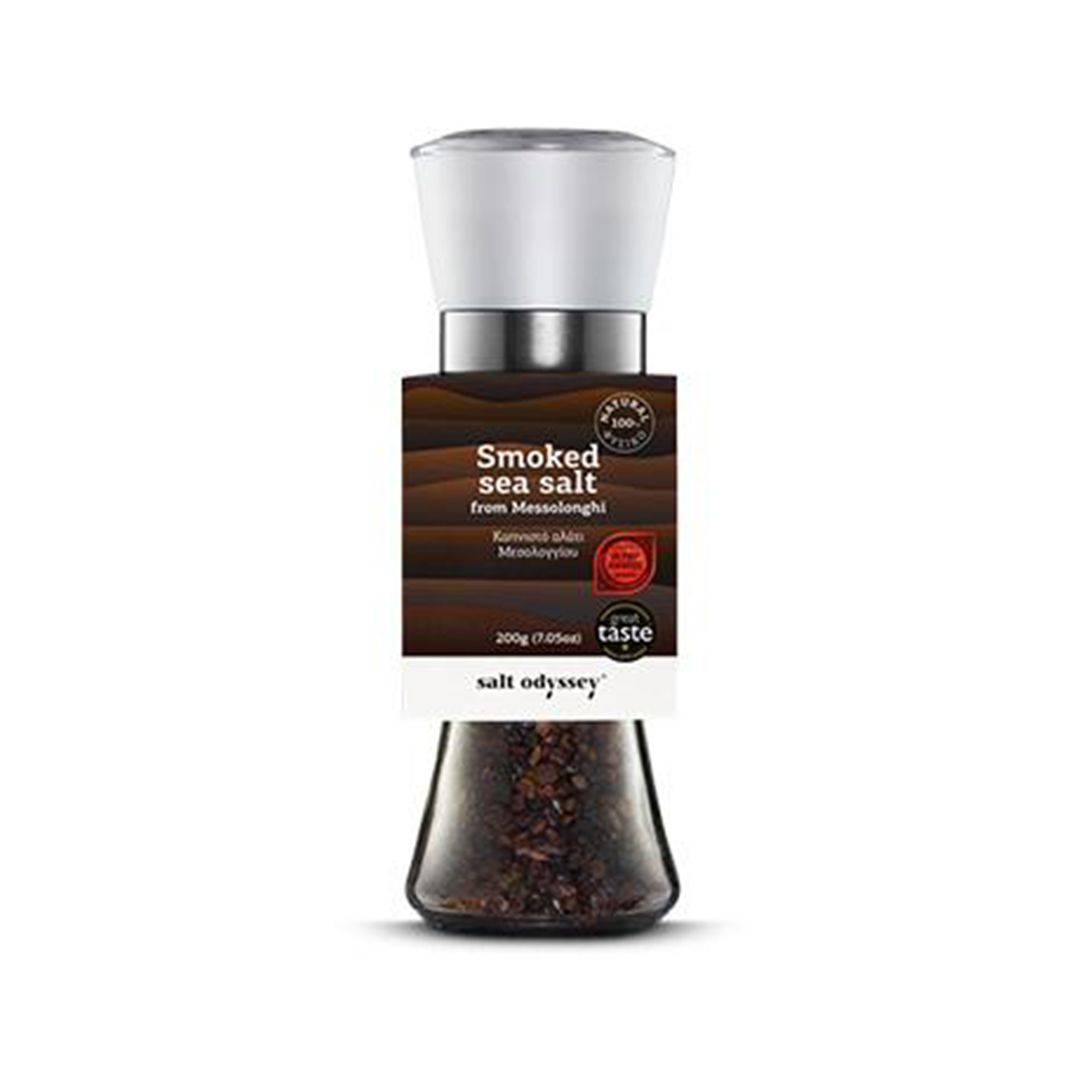 ΠΕΡΙΓΡΑΦΗ: 100% φυσικό θαλασσινό αλάτι Μεσολογγίου καπνισμένο με ξύλα οξιάς για 140 ώρες
