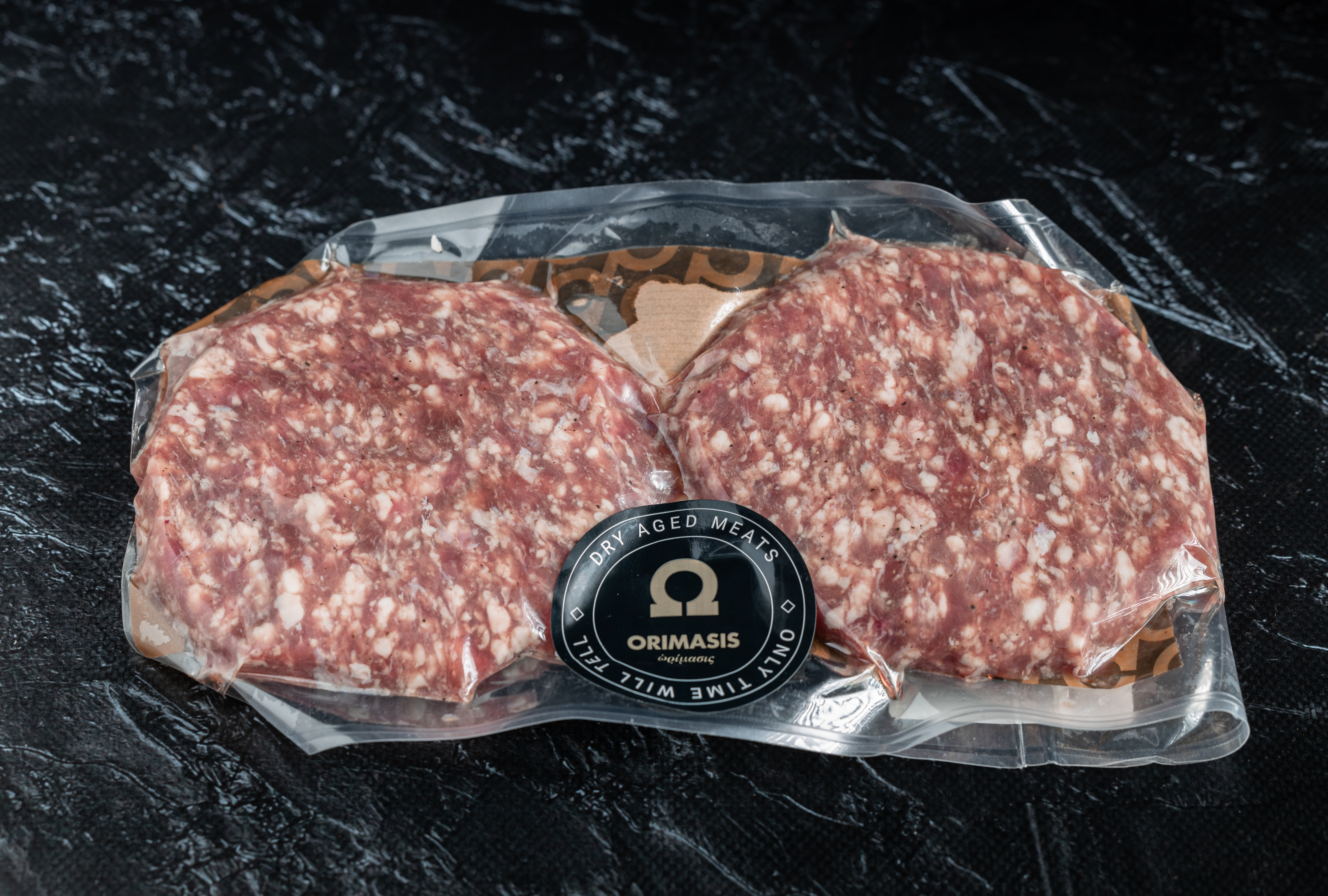 Ζουμερός κιμάς (2*0.220g) από brisket και chuck roll περασμένος μια φορά και ελαφρά ανακατεμένος ώστε το burger να παραμένει αφράτο κατά το ψήσιμο.